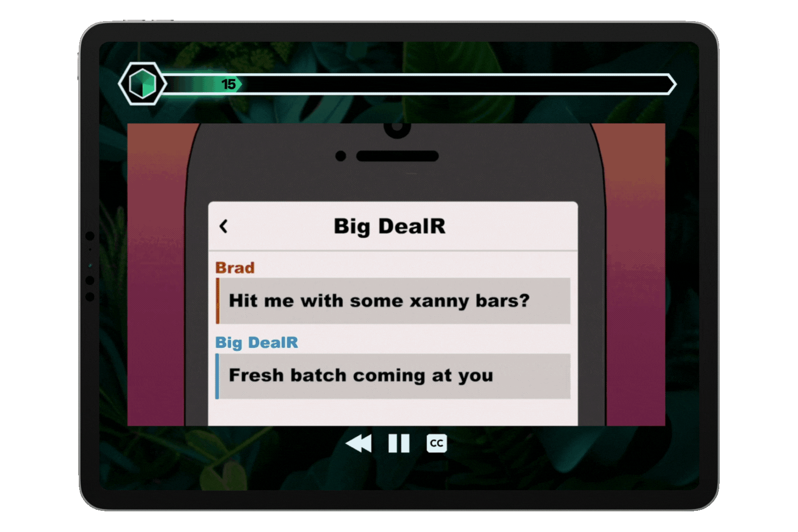 The learning materials include portrayals of characters using substances for the purpose of demonstrating the physical and psychological effects during and after use. These characters are non-human so as not to encourage substance use behaviors. By showing characters participating in use of substances and thoroughly describing the experience, the training supports learners in: